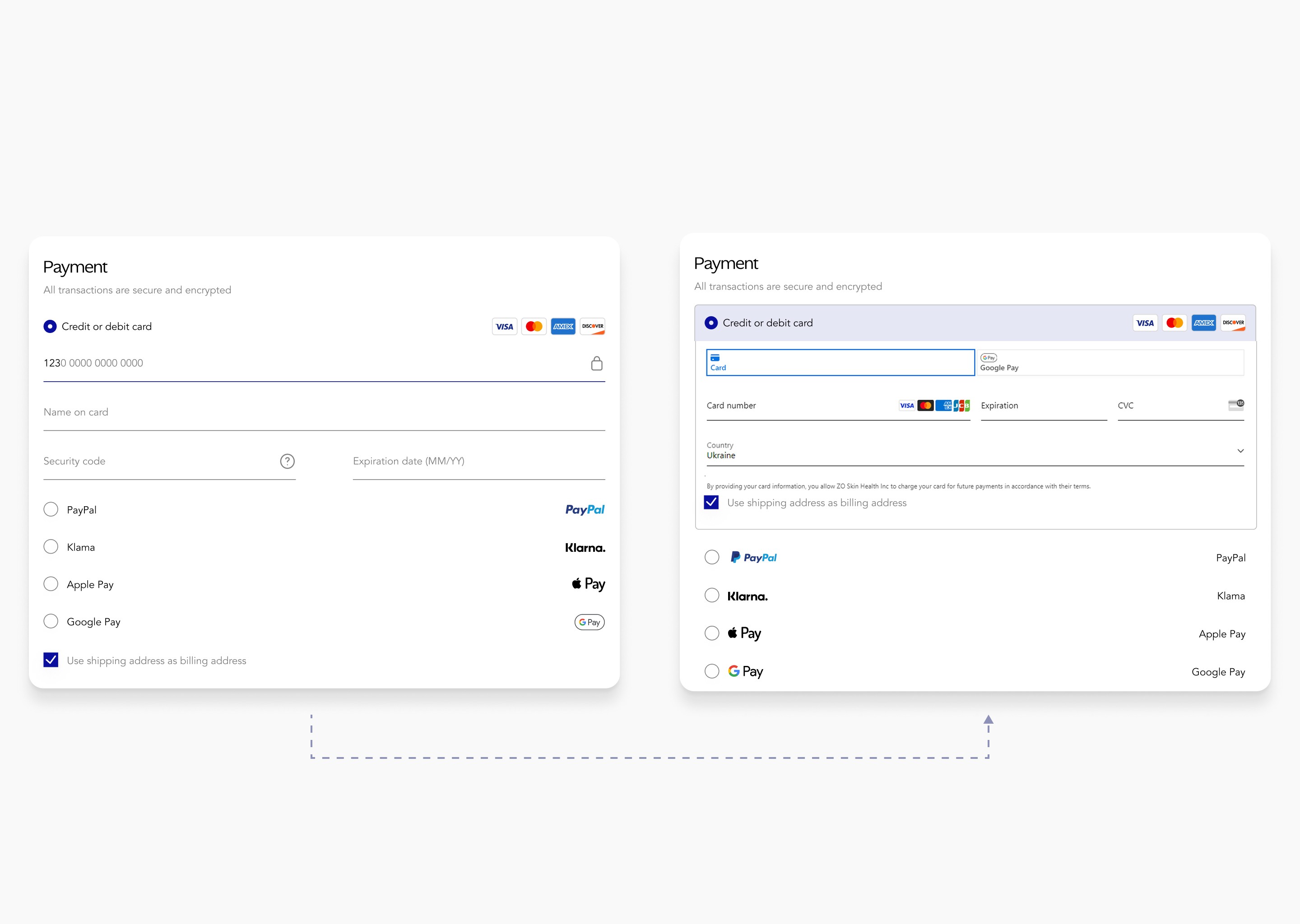 While the initial design used custom fields for a seamless look, technical and security requirements mandated the use of Stripe Elements. This created a conflict: Stripe’s fixed iframe structure didn't naturally support my "auto-collapsing" logic and custom styling.